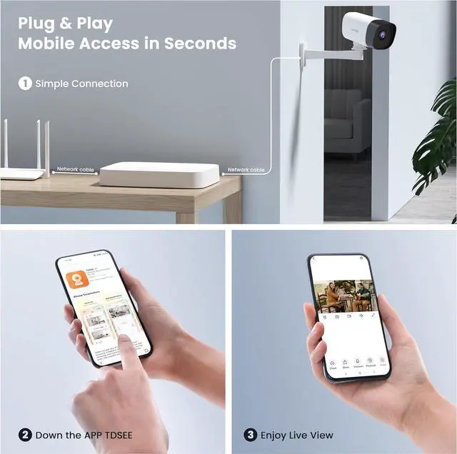 Supporting IEEE 802.3af PoE Standard, Tenda Security Camera Kit needs only one ethernet cable to supply power and transmit data, no complicated wiring or additional power sources are needed.
