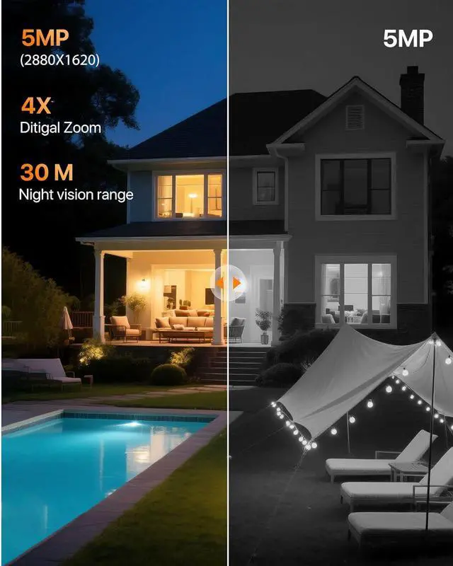 Color Night Vision with Enhanced LightingThis outdoor WiFi camera is equipped with 4 adaptable lights that switch between spotlights and IR. It supports three night vision modesfull-color, black-and-white, and smartproviding reliable night vision monitoring up to 98ft, even in low-light environments.