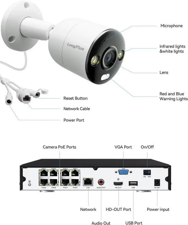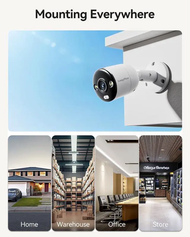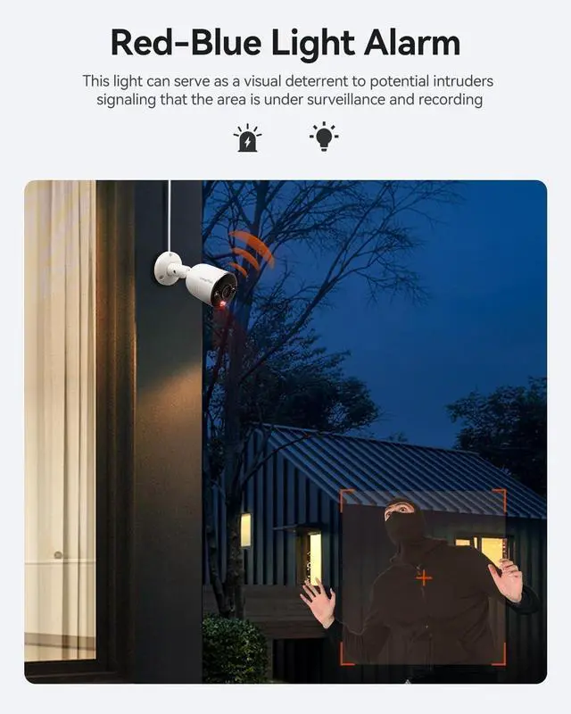 Triple Alarm Modes, Dynamic Red & Blue Light AlertsThis LongPlus PoE security camera offers three powerful alarm modes to keep your property safe: a sound alarm, flashing LED lights, and a striking red-and-blue light alarm. The striking dynamic red-and-blue lights combined with a loud warning sound create a powerful visual and auditory impact, effectively warning off potential intruders even from a distance. Additionally, the system supports multi-channel alert notifications(email, app notification etc.), ensuring you receive timely updates directly to your device. With these comprehensive alarm features, you can stay informed and act quickly for maximum security.