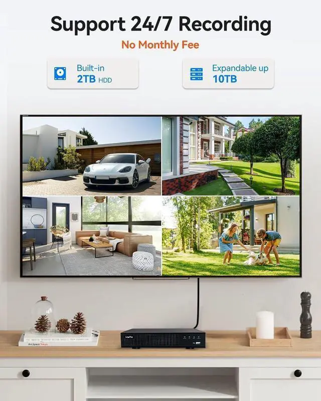24/7 HD Continuous Recording, 8-Channel 10TB Expandable StorageThe LongPlus NVR security system offers reliable 24/7 5mp HD video recording with sound, ensuring every moment is captured with stunning clarity. The 8-channel NVR comes equipped with a built-in 2TB HDD, providing ample storage for continuous monitoring, and is expandable up to 10TB to meet your long-term security needs. For added convenience, the system also supports cloud storage, providing multiple options to safeguard your footage.