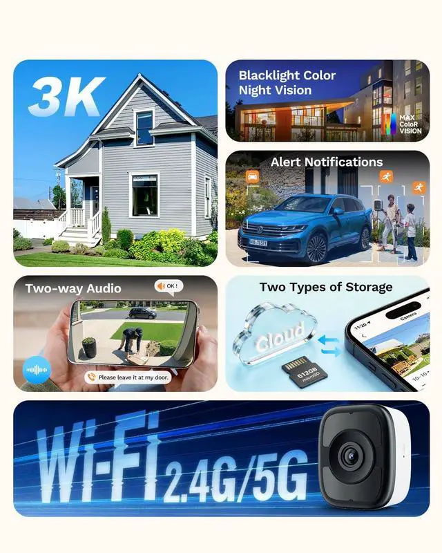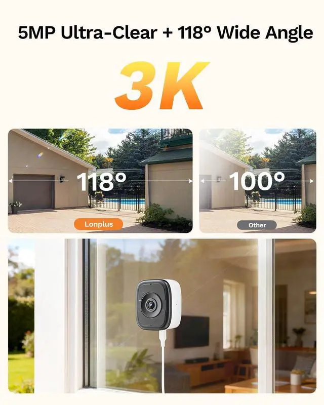 1Full Color Night Vision2Avoid Damage3Sound Alarm1SD / Cloud Storage2118° Wide Angle3Connect APP Model NameLongPlus Window Canera (CDK1-W1X5-B)Effective Still Resolution 5MP 3KControllerSV360 APPStorage TypeSD Card( support up to 512GB), Cloud Storage( need subscription)WiFi BandSupport 2.4GHz, 5GHzColor Night VisionYesFill LightsNoDetectionPerson, VehicleAlertsSounds,Push notificationsMount TypeWindow Mount, No-trace adhesiveAdsorption TypeMagneticSize2.1 x 2.5 x 1.2 inchesWeight60g/ 2.12oz Magnetic Attraction Permanent Power Supply 2-Way Audio Retaining Clips Included AI Detection 3K 5MP Ultra-Clear Specification