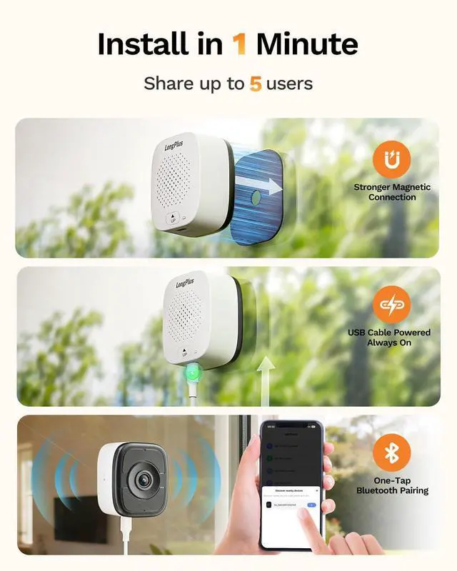 LongPlus window security camera uses strong magnetic adsorption and can be installed within 60 seconds. It can be torn off without leaving any glue, and you can change different window or glass scenes at will.