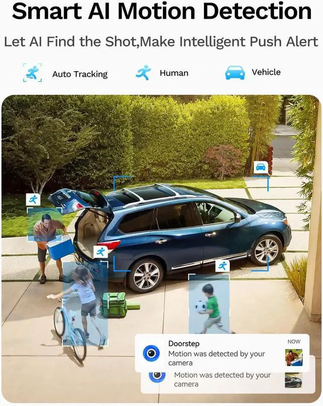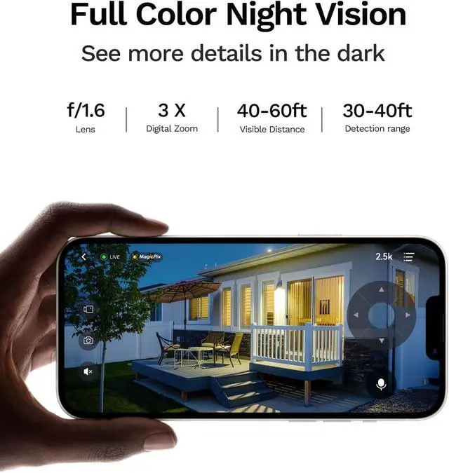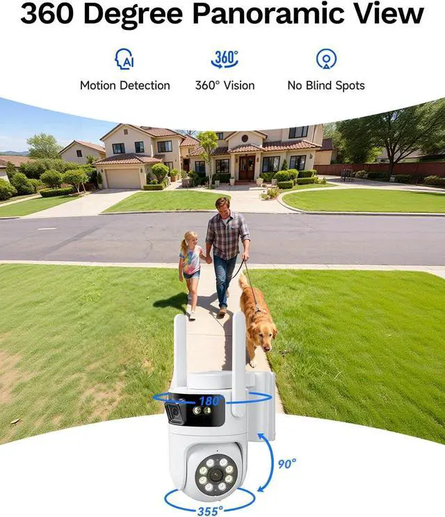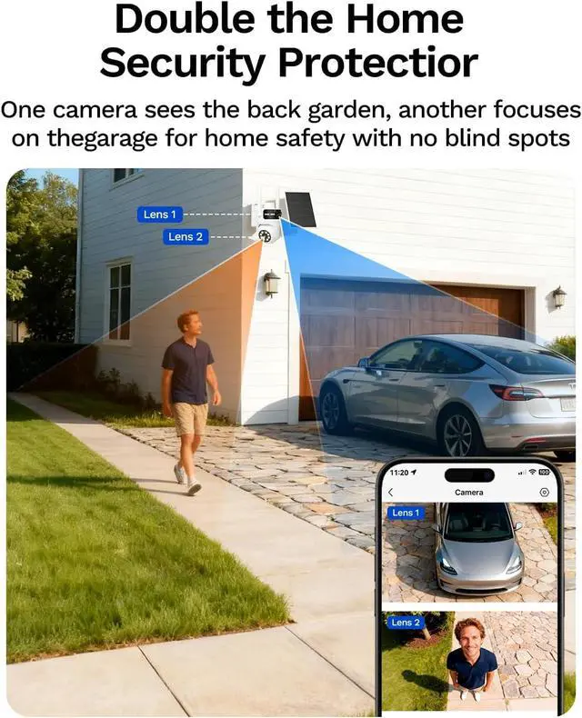 Dual Lenses. Dual Coverage This 2-in-1 security camera eliminates blind spots for complete home defense. The fixed lens keeps watch over key areas like your garage, while the pan-tilt lens scans 350° horizontally and 90° vertically. From porch to driveway, enjoy distortion-free, crystal-clear monitoring that doubles your protection and elevates your home security to the next level.