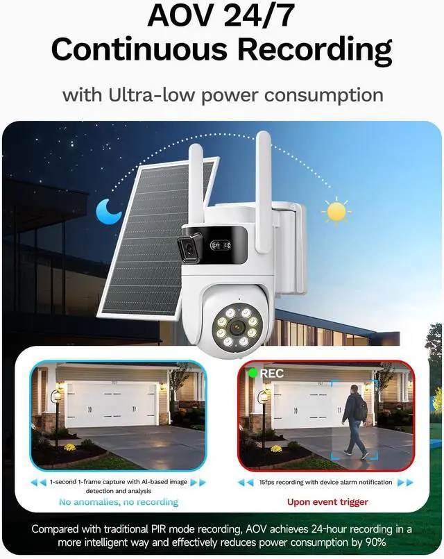 Solar Power and AOV RecordingWith 8W solar panel and 8800mAh rechargeable battery Longplus solar home security camera can easy to install in anywhere without electric. With advanced AOV technology, this no wifi security camera can record at 15 fps when trigger by a person or car, but only 1 fps (adjustable) in static environments. It reduce power consumption by approximately 90% and keeps recording about one month even no sunlight (affected by the frequency of triggering events).