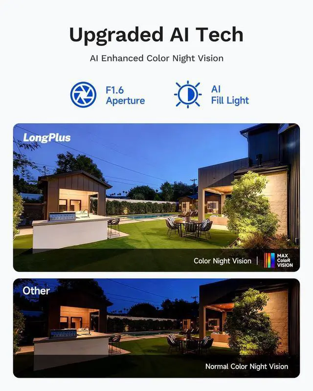 13K/5MP Ultra HD Video2Al Night Vision3Cover Every Corner4Two-way Audio5Weatherproof1No Monthly Fee2Expandable Storage3Dual-Link Connection4Smart Auto-Deterrence5Strobe Light Alarm1Self-Powered Security2Smart Recognition3Reliable Intelligence LongPlus Wireless Security Camera System LongPlus Wireless Security Camera System