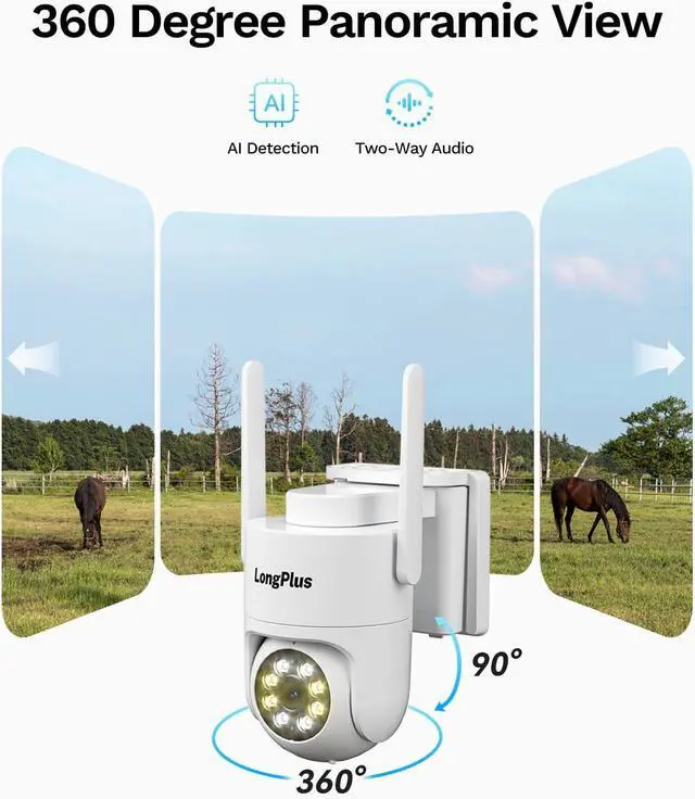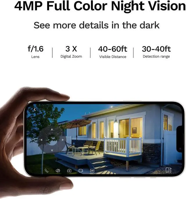 4MP Color Night Vision and 360°Full Coverage Equipped with cutting-edge color night vision technology, this 2K QHD resolution night vision security camera can capture vivid and vibrant clear color images even in low light condition within 33ft. Pan 355°and tilt 90° rotation and 3X digital zoom in and out, provides complete coverage, easy to install and you can adjust any degree you want.