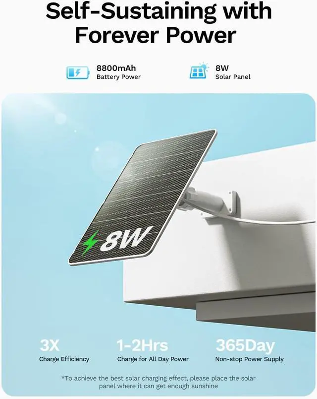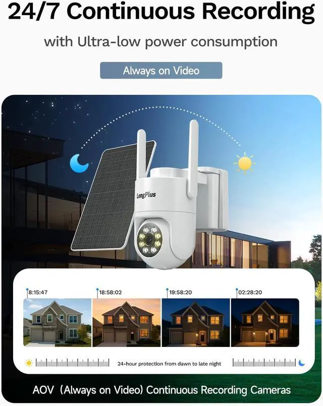 Solar Power and AOV 24/7 RecordingWith 8W solar panel and 8800mAh rechargeable batteryLongPlus solar camera for home security can easy to install in anywhere without electric. With advanced AOV technology, this no wifi security camera can record at 15 fps when trigger by a person or car, but only 1 fps (adjustable) in static environments. It reduce power consumption by approximately 90% and keeps running about one month even no sunlight (affected by the frequency of triggering events).