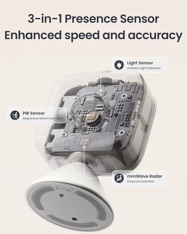 AI Anti-Interference: Enable AI self-learning with one click to automatically filter out interference from fans, air conditioners, and more, improving detection accuracy. The magnetic base allows the Presence Sensor to rotate and adjust its detection zone, effectively preventing false triggers from pets and meeting diverse home needs.