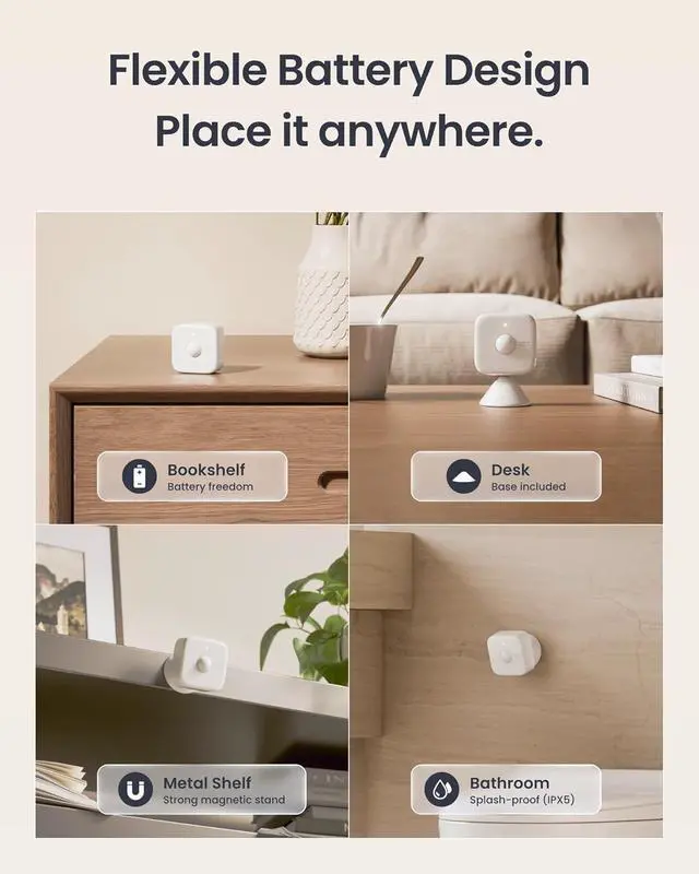 Battery Design & Flexible Installation: Equipped with a long-lasting battery, this sensor frees you from power cables and can operate up to 2 years on a single charge. The magnetic base allows flat placement, wall mounting, and adjustable detection angles, making it ideal for bathrooms, living rooms, studies, and other areas throughout your home.