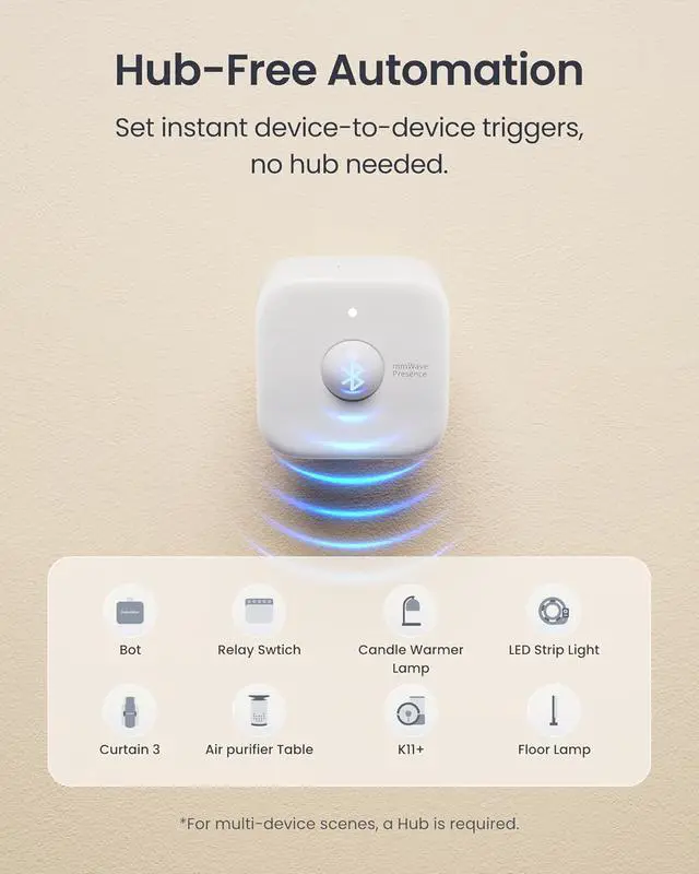 Smart Automations: Presense Sensor works without a hub for instant, second-level response. Seamlessly pair with SwitchBot devices (e.g., Bot, Curtain, Light Series, etc. ) with local linkage and set up to 5 automations. For more complex automations, pair with a SwitchBot Hub to trigger smart scenarios, such as automatically turning on lights and air purifiers while working from home.