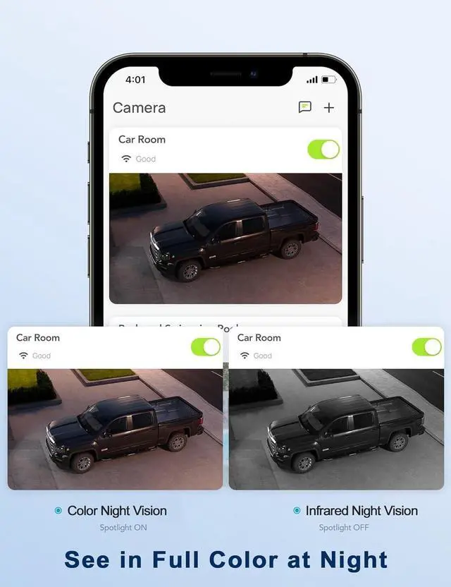 Smart Motion Detection & AI Tracking. Get real-time alerts on your phone when motion is detected. AI-enhanced detection accurately identifies people, vehicles, pets, and packages (subscription required), reducing false alarms. The camera automatically tracks movements and you can activate four bright spotlights or voice alarm to deter intruders