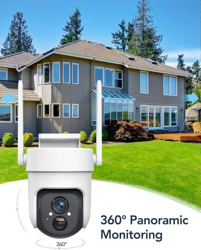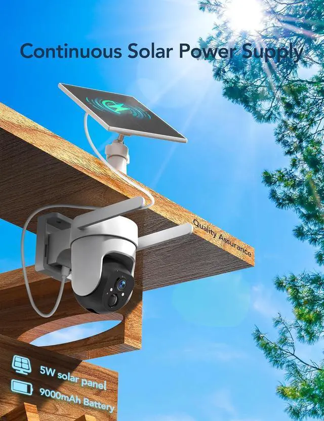 Solar Powered & True Wireless The solar security camera includes a built-in rechargeable battery and solar panel, ensuring continuous power supply as long as there is sunlight, allowing the camera to operate continuously. Before first use, the camera must be fully charged using the power cord; afterwards, it can be powered by the solar panel for extended periods. Battery performance will vary depending on sunlight intensity, activity level, and network conditions