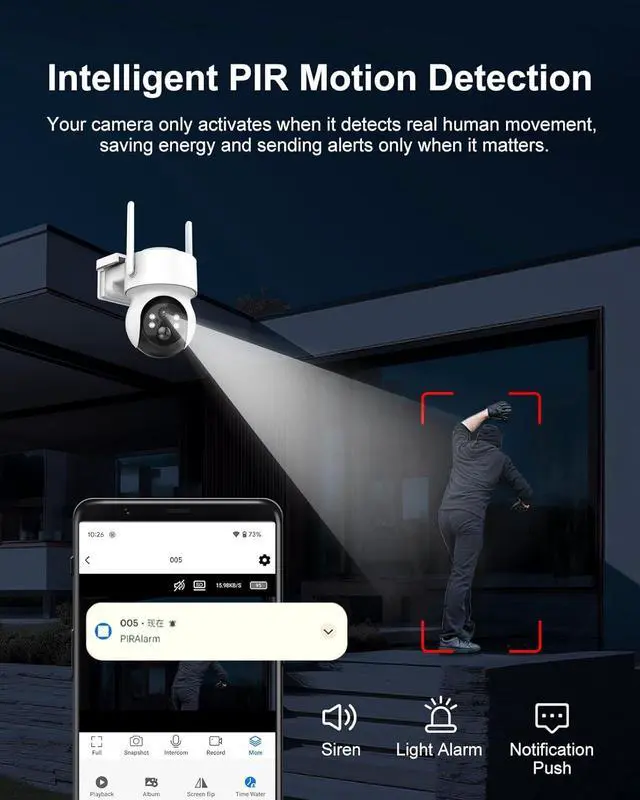 Smart PIR Motion Detection & Siren AlarmBuilt-in PIR motion sensors detect human movement while reducing false alerts. Receive instant notifications and activate the siren alarm to deter intruders, keeping your home and property safe