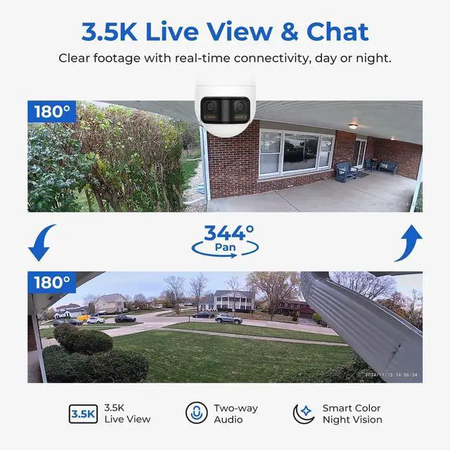 Rotatable 180° Panorama: The EC6 Panorama's dual lenses capture 180° panoramic footage and rotate for automatic people tracking. This outdoor camera also offers 344° panning and 90° tilting in real-time via the app