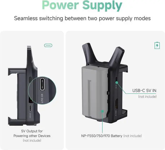 Multiple Power Options: There are two methods to power CineView Nano wireless camera transmitter, it support NPF-550/NP-F750/NP-F970 batteries (not include) and 5V USB in (not include) , no need to worry run out of power. Also, an additional 5V USB-C output can be used for powering other devices