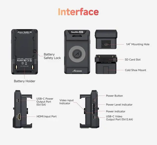 Package Included & DimensionsAccsoon SeeMo 4K Wired HDMI Video Transmitter*1USB-C to Lightning Cable*1USB-C to USB-C Cable*1Cold Shoe Adapter*1. Dimensions: 3.62 × 2.13 × 1.82 inch | Weight: 0.255 lb. Important Notes1. An HDMI cable is required to connect SeeMo 4K to cameras (not included). 2. An NP-F series battery (e.g., NP-F550/750/970) is required to power on SeeMo 4K (not included)