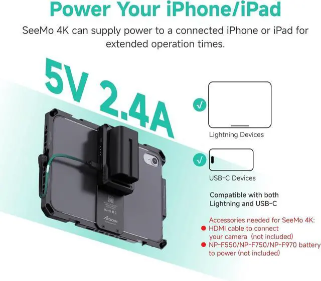 Power Supply: Accsoon SeeMo 4K ipad can run for hours on a NPF550, NPF750, or NPF970 battery (not included). With quick release design, it is easy to install on Accsoon Powercage for iPad, or work with Phone. It can also charge your Phone or iPad5V/2.4A