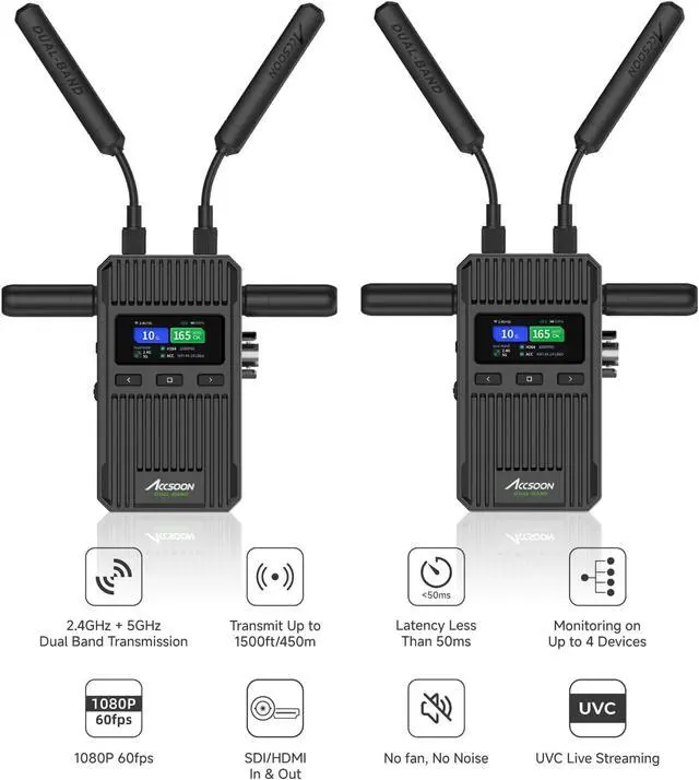 Latency and Range: Accsoon CineView 2 SDI wireless video transmission systems can transmit 1080P 60 fps video and audio signals across a 1500 ft (450 m) line of sight range, all while maintaining an impressively low latency of under 50 ms
