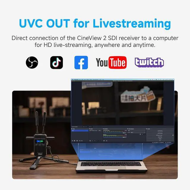 UVC Livestreaming: From the receiver to the computer, you can use a usb-c cable (user-provided) to transfer the footage received by the receiver to any third-party streaming platforms (OBS/Youtube/Tiktok/twitch ) on your computer for livestreaming
