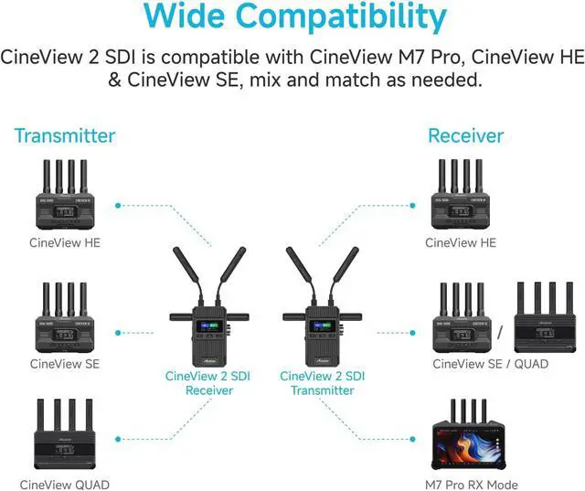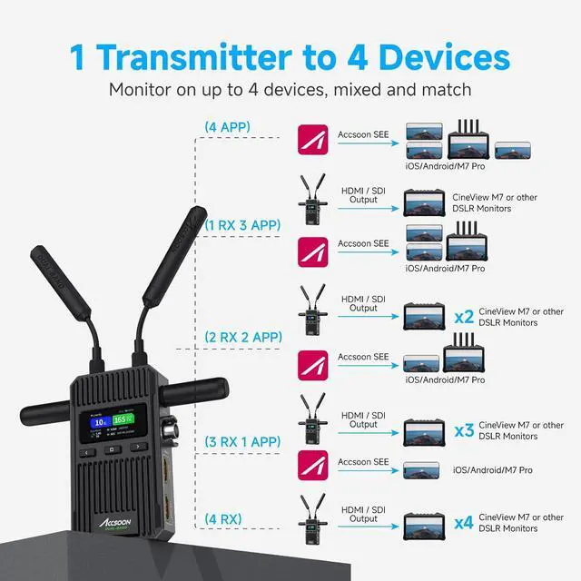 4 Device Monitoring: The Accsoon CineView 2 SDI transmitter wirelessly sends video to any combination of CineView receivers and smart devices (iOS/Android), supporting up to 4 devices. Compatible with CineView M7 Pro monitor, CineView HE/SE/Quad wireless video transmission, allowing users to mix and match as needed