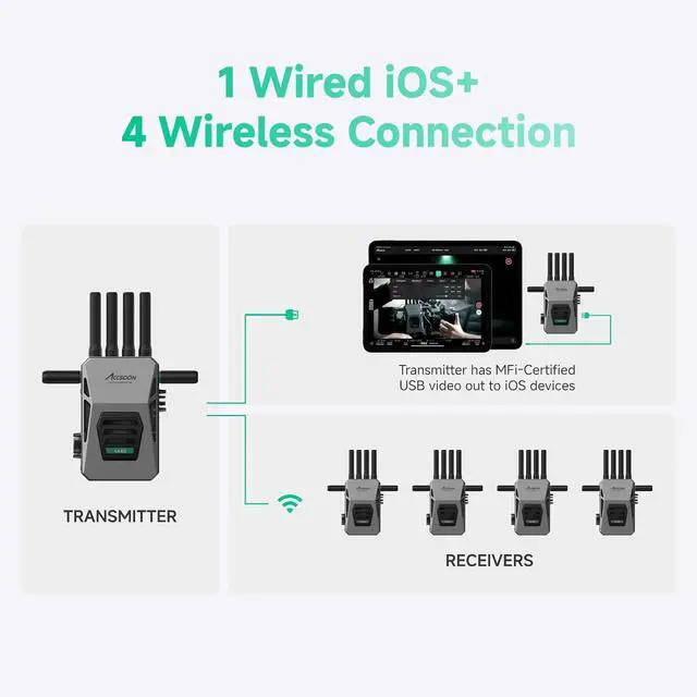 Compatible iOS Devices: Accsoon CineView Master 4K transmitter compatible with iPhone 12 above and later; iPad Pro 12.9-inch, Gen 3 above and later; iPad Pro 11-inch Gen 3 above and later; iPad Gen 9 above and later; iPad Air Gen 4 above and later; iPad mini 6. Please note the transmitter number of simultaneous connections is one device