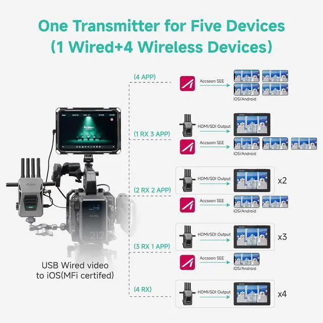 Up to 5 Receivers Monitoring: Accsoon CineView Master 4K can transmit to up to 5 devices simultaneously: a combination of 1 wired connection and 4 wireless connections. The transmitter includes a USB-C Video Out port that can transmit both video and audio signals to iOS devices(1 wired connection : Accsoon CineView Master 4K Transmitter is compatible with iPhone 12 or later; iPad Pro 12.9-inch, Gen 3 or later; iPad Pro 11-inch Gen 3 or later; iPad Gen 9 or later; iPad Air Gen 4 or later and iPad
