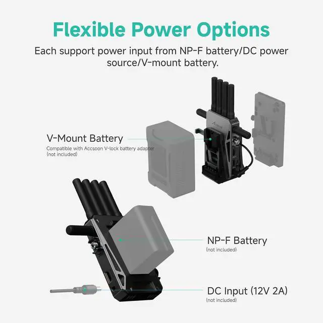 Unified Power Solution for Camera & Transmitter: Seamlessly power your CineView Master 4K/2 SDI wireless transmitter and camera simultaneously via a single V-Mount battery (95Wh200Wh+) (battery not included). The integrated short captive DC cable eliminates clutter while delivering stable, extended runtime for long shoots