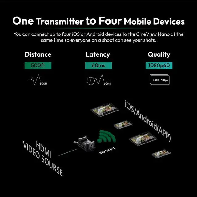 One Transmitter, Four Mobile Devices: Accsoon Mini CineView Nano wireless video transmission system support to transmit the same video from the camera into 4 iOS/Android devices as a monitor with Accsoon SEE App to realize multi-devices monotoring