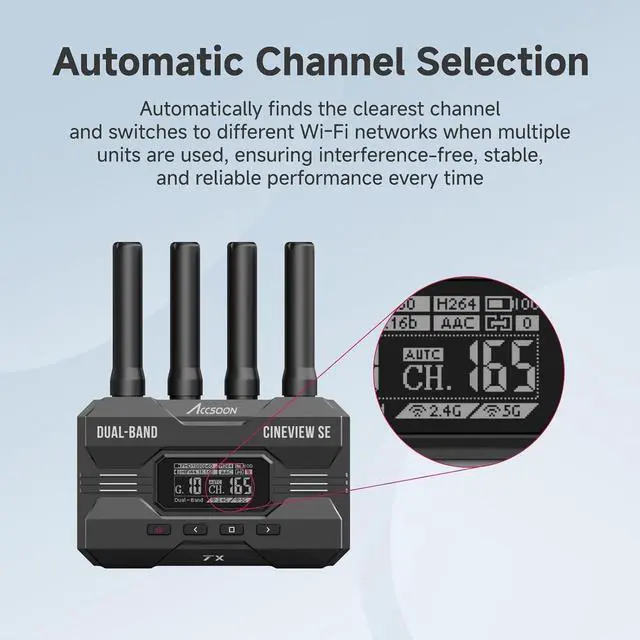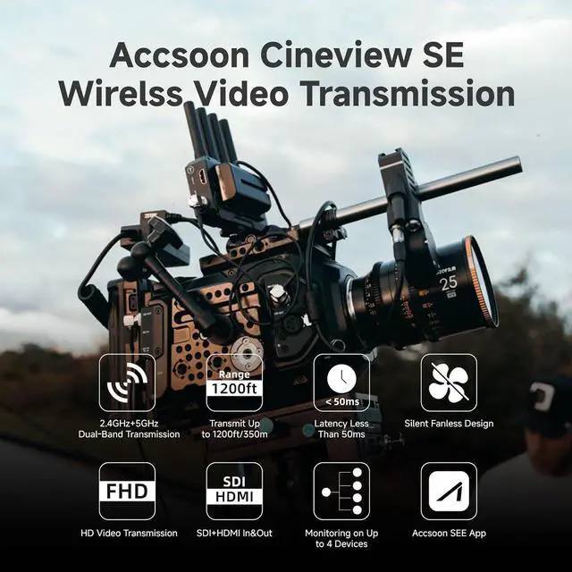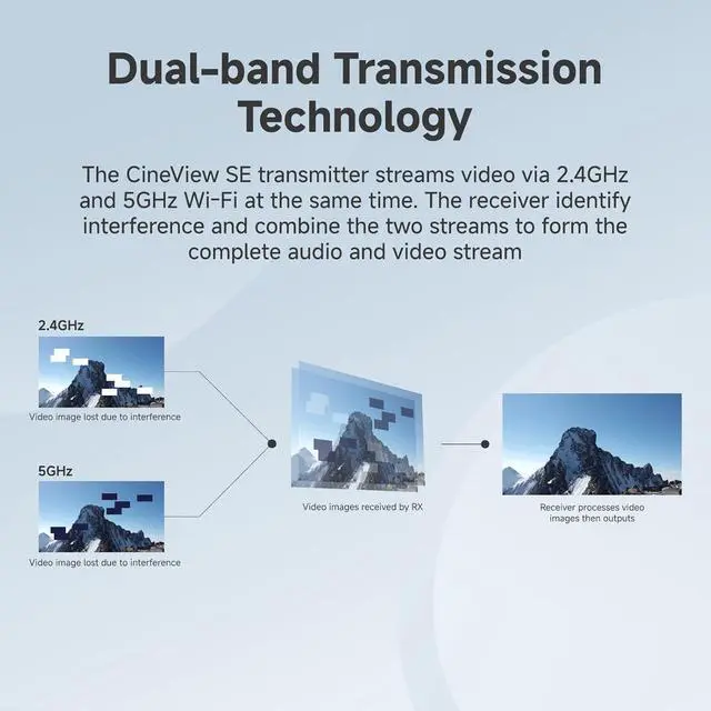 Dual-Band Transmission: Cineview SE SDI HDMI Transmission System features 2.4GHz and 5GHz Dual-Band transmission technology, bringing industry-leading stability to the wireless video transmission system help to experience smooth and stable shooting, and unparalleled shooting with incredible anti-interference technology