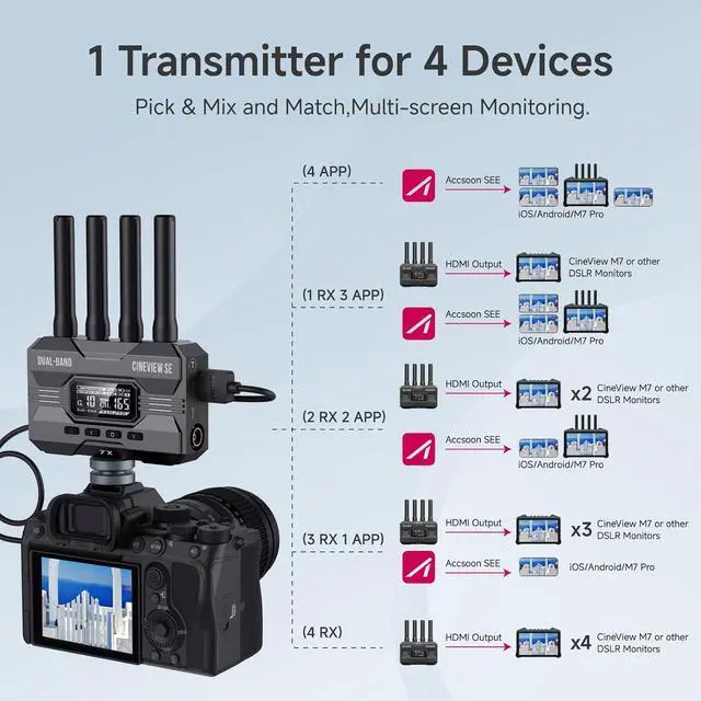 One Transmitter for Four Devices: With CineView SE wireless SDI transmitter, you can transmit video up to 4 receivers (standard receiver and mobile devices, mix and match). You can also match other CineView receiver like CineView HE RX, Quad RX, 2 SDI RX and M7 Pro Camera Field Monitor