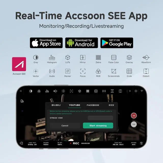 Accsoon SEE App Monioring&Livestreaming: Accsoon CineView SE wireless monitor transmitter can used with our Accsoon SEE app to monitoring, the app supports RGB, Audio level, Histogram, Grids, Waveform, Overlay, Focus peaking, LUTs, Marker, Color Range, Zebra, Gray, False color, Mirror, Desqueeze, Screenshot. It also supports RTMP live streaming, allowing direct broadcasting to platforms like YouTube, Facebook, and Twitch