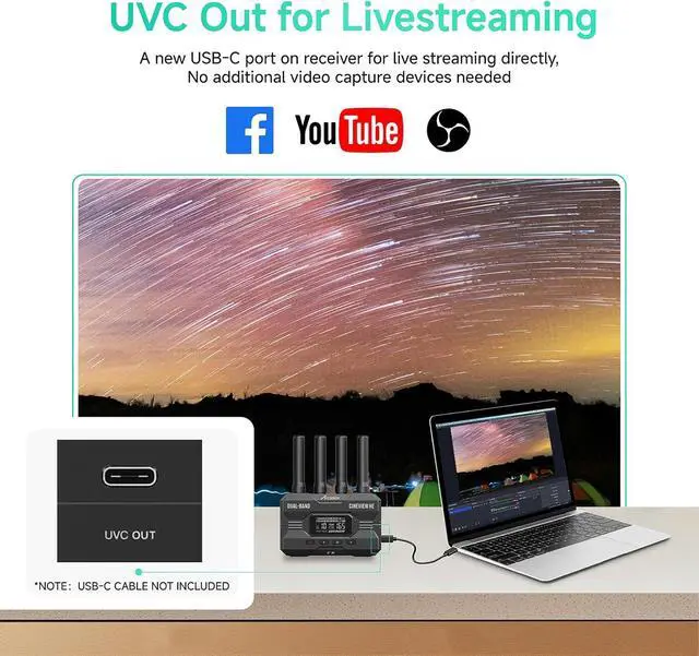 UVC,Simplify Your Live StreamingCineView HE has added a brand-new feature on the receiver: UVC out. From the receiver to the computer, you can use a USB-C cable (user-provided) to transfer the footage received by the receiver to any third-party streaming platform on your computer for live streaming, such as OBS and YouTube, etc. No additional video capture devices needed, the new UVC feature is all you require to live streaming, anywhere and anytime