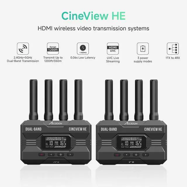 Dual-Band Transmission: The Accsoon CineView HE wireless video transmission revolutionizes professional workflows with 2.4GHz+5GHz Dual-Band transmission technology, delivering rock-solid stability for flawless video/audio streaming. Say goodbye to signal drops or interferenceour advanced anti-jamming tech ensures smooth 1080p 60fps transmission even in crowded environments. Perfect for filmmakers and live event crews who demand zero compromises during high-stakes shoots like weddings, sports broadcasts, or cinematic productions