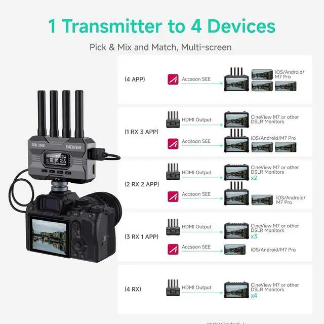 1 Transmitter to 4 Devices: With Accsoon CineView HE wireless video HDMI transmitter and receiver, you can transmit video and audio to up to 4 receivers (iOS and Android, mix and match), to keep the whole crew in the loop, it can be used with Accsoon SEE app for easy and professional monitoring too. CineView HE also compatible with CineView M7 Pro monitor and CineView SE/2 SDI/Quad wireless video transmission
