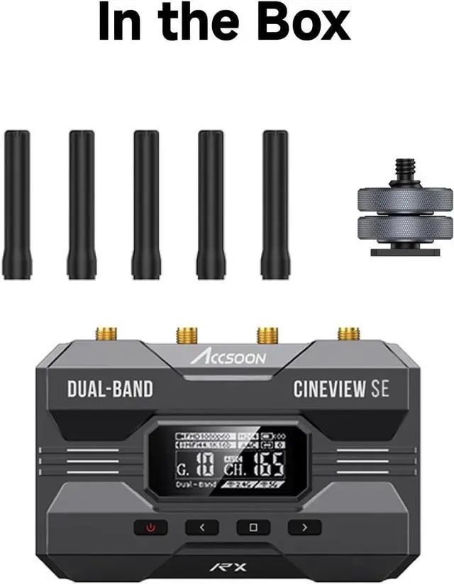 In the Package: There is one SE wireless video receiver, five antennas,one cold shoe. Please note that the CineView SE receiver units are for CineView SE, HE, 2 SDI Quad systems. It can not be used alone