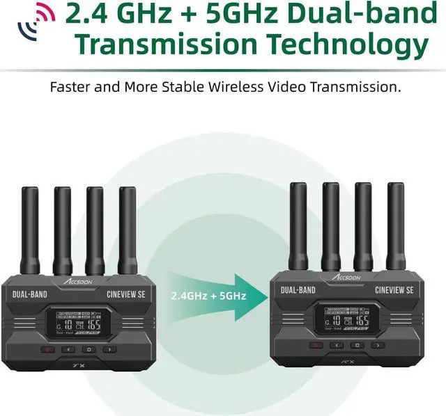 Dual-Band Transmission for Unmatched Stability: The CineView SE SDI Video transmitter streams video via 2.4GHz and 5GHz Wi-Fi at the same time. The receiver identify interference and combine the two streams to form the complete video stream. It delivers seamless performance even in challenging environments with heavy interference, perfect for professional photographers and filmmakers