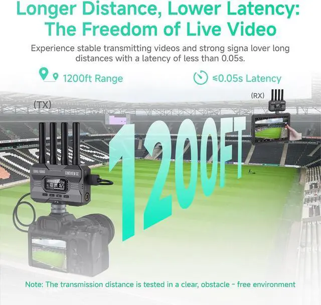 • Long-Range Wireless Transmission with Ultra-Low Latency: With a transmission range of up to 1200ft (365m), the CineView SE wireless camera transmitter can cover areas as large as a football field, ensuring smooth video transfer over long distances. At a latency of just 0.05 seconds, it provides near-real-time monitoring. Note: Transmission distance is tested in a clear, obstacle-free environment