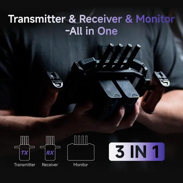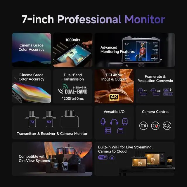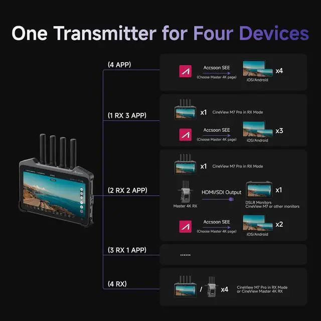 3-in-1 Transmitter&Receiver&Monitor: CineView M7 Pro integrates a monitor, transmitter, and receiver into one compact unit, offering unmatched convenience for professional workflows. It features three distinct modes. Monitor Mode: Connect to cameras via HDMI or 3G-SDI for color-accurate monitoring on its professional 7-inch screen. TX Mode: Wirelessly transmit video to up to 4 devices simultaneously, including CineView Master 4K receivers, other M7 Pro monitors in RX mode, and mobile devices for real-time monitoring. RX Mode: Built-in dual-band receiver pairs seamlessly with CineView transmitters (HE/Master 4K/SE/2 SDI/QUAD) for wireless video transmission