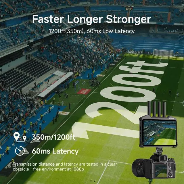 Dual-band TransmissionThe CineView M7 Pro wireless HDMI/SDI transmitter-receiver leverages Accsoons pioneering and patented dual-band technology to dynamically manage audio and video data across 2.4GHz and 5GHz frequencies. This cuts end-to-end latency to just 60ms while supporting a long transmission distance of 1200ft (Tested under clear, obstacle-free conditions)