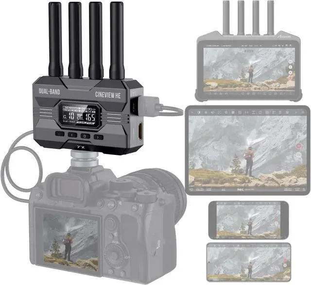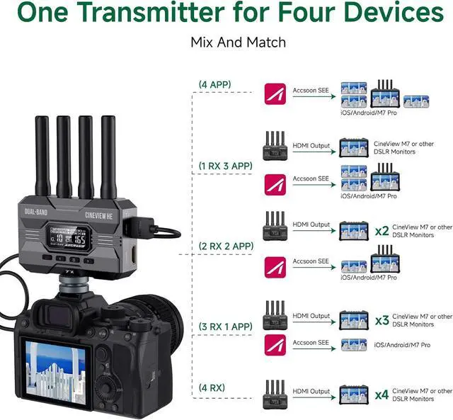 Multi-Device Monitoring: The Accsoon HE wireless camera transmitter enables simultaneous video transmission to mobile devices (compatible with Android and iOS) while supporting integration with CineView M7 Pro monitors, as well as CineView 2 SDI/SE/Quad receivers. These two monitoring methods can be mixed and matched, allowing for concurrent monitoring across up to 4 devices