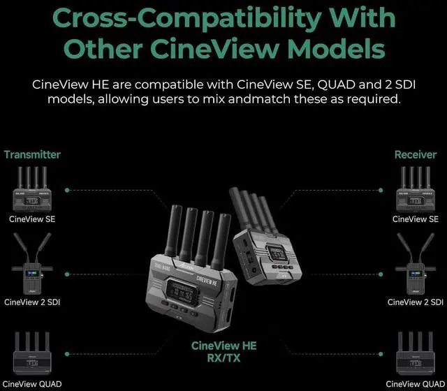 1200ft Long Distance, 0.06s LatencyCineView HE enables users to experience the stability of transmitting images and audio smoothly over long distance, even the size of a football pitch, with a latency of less than 0.06s. (Note: Transmission distance is tested in a clear, o