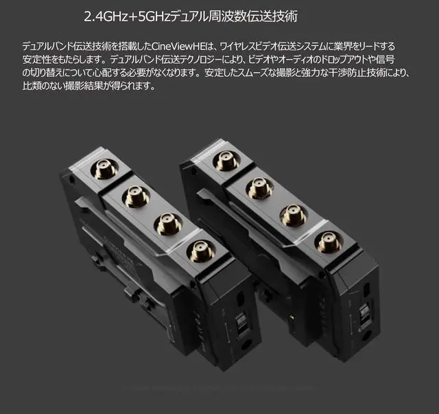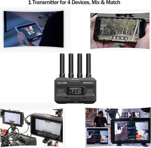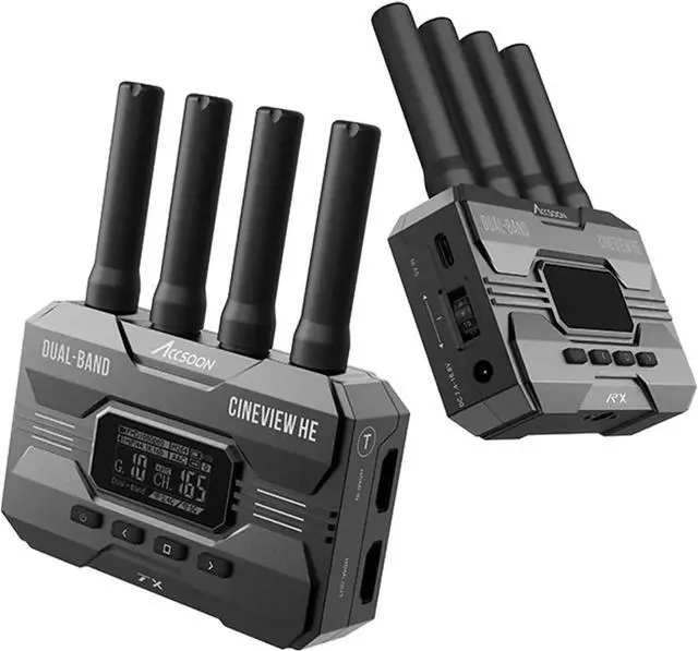 2.4GHz+5GHz Dual-Band Transmission TechnologyDeveloped by Accsoon engineers, CineView HE is equipped with Dual-Band transmission technology to bring industry-leading stability to the wireless video transmission system. Dual-Band transmission technology means you never have to worry about video or audio drop or switch signal issues again. Designed for demanding photographers, experience smooth and stable shooting, and incredible anti-interference technology to get unparalleled shooting results.