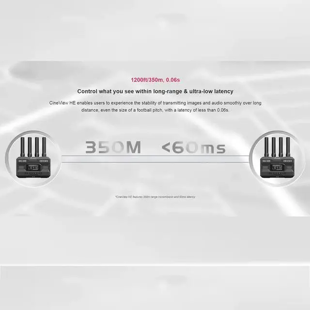 1200ft Transmission Distance, 0.06s Low LatencyCineView HE enables users to experience the stability of transmitting images and audio smoothly over long distance, even the size of a football pitch, with a latency of less than 0.06s.