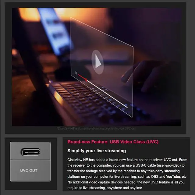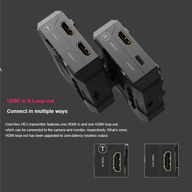 HDMI In & Loop-outCineView HEs transmitter features one HDMI in and one HDMI loop-out, which can be connected to the camera and monitor, respectively. Whats more, HDMI loop-out has been upgraded to zero-latency lossless output.