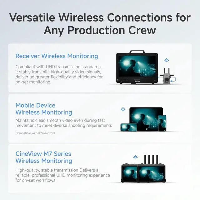 Versatile Wireless Connections for Any Production CrewReceiver Wireless Monitoring, Mobile Device, CineView M7 Series.
