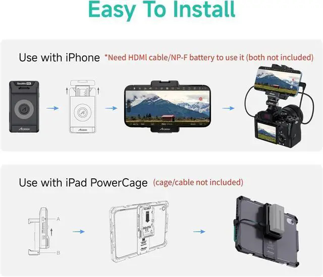 Power SupplyAccsoon SeeMo 4K hdmi video transmission system support to power your Phone/iPad(Lightning and USB iOS devices) with 5V- 2.4A charging port by a USB-C cable, no need to worry about out of battery when working. Designed with NP-F battery holder, directly use NP-F550/F750/F970 battery (not include) for power supply to iOS devices(not included)