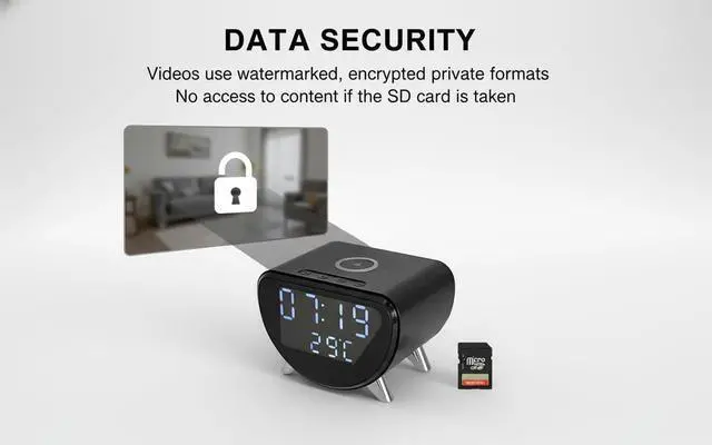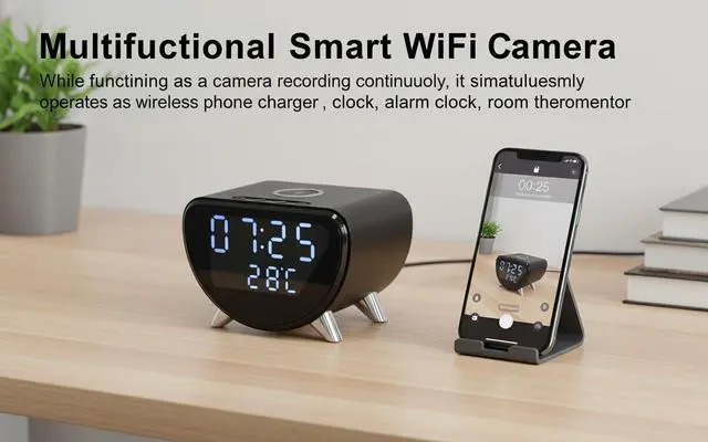 4K UHD 20fps delivers clear, smooth video for detailed monitoring. 5-in-1 versatility: camera, wireless phone charger, clock, alarm, and room thermometer, maximizing space and utility. 100-degree wide-angle lens covers larger areas for enhanced security. No Audio.