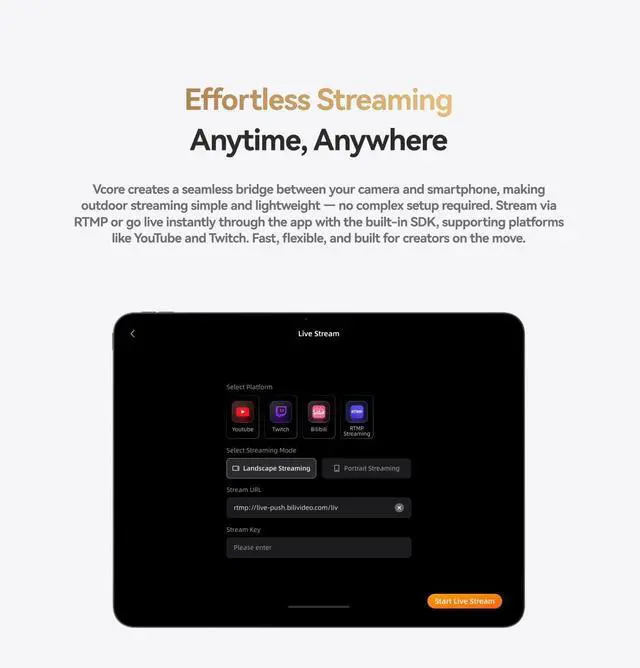 Wired and Wireless Dual Modes with Free Switching- Vcore supports simultaneous wired connection to your camera while wirelessly linking to smartphones or tablets via the 5GHz band, enabling real-time remote monitoring. The wireless transmission range extends up to 100 meters (line of sight) with a low latency of approximately 65ms, delivering smooth 1080p 60fps video quality.
