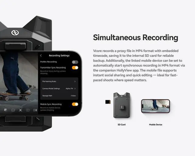 Dual-Backup Recording: Security and Convenience Combined- Vcore supports simultaneous dual-path recording: on one hand, it saves proxy files with embedded timecode to the internal SD card (requires separate purchase) as a reliable backup; on the other hand, it enables synchronous MP4 recording on mobile devices via the HollyView app, facilitating quick editing and instant social sharing making it especially ideal for fast-paced shooting scenarios.