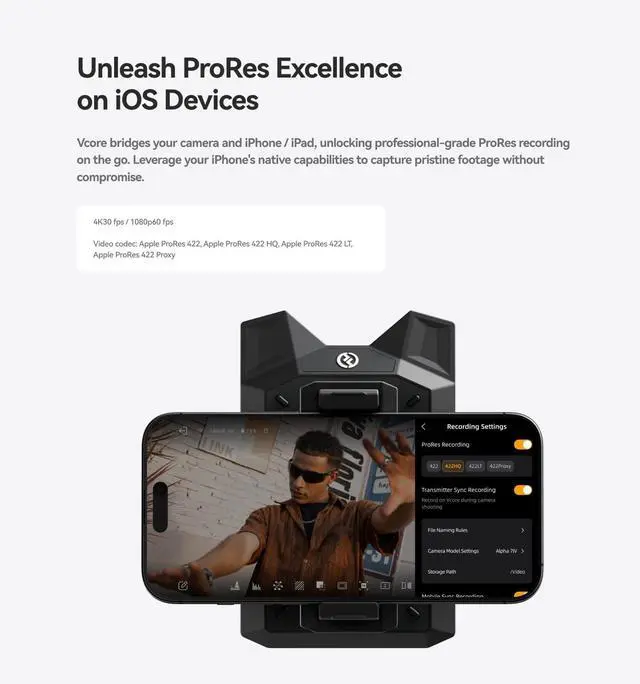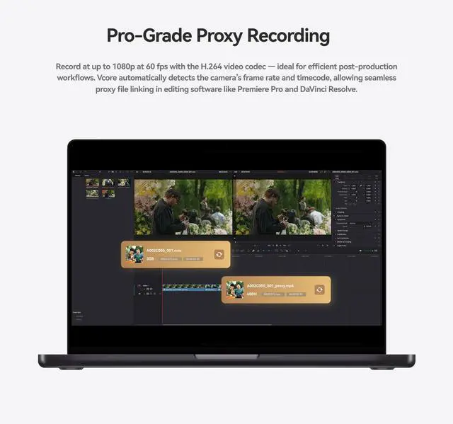 Pro-Grade Proxy Recording, Seamless Post-Production Integration- Vcore supports recording at up to 1080p 60fps with H.264 encoding and intelligently detects the cameras frame rate and timecode. The resulting MP4 proxy files can be seamlessly linked with original footage, offering full compatibility with mainstream editing software such as Premiere Pro and DaVinci Resolve significantly enhancing post-production efficiency.